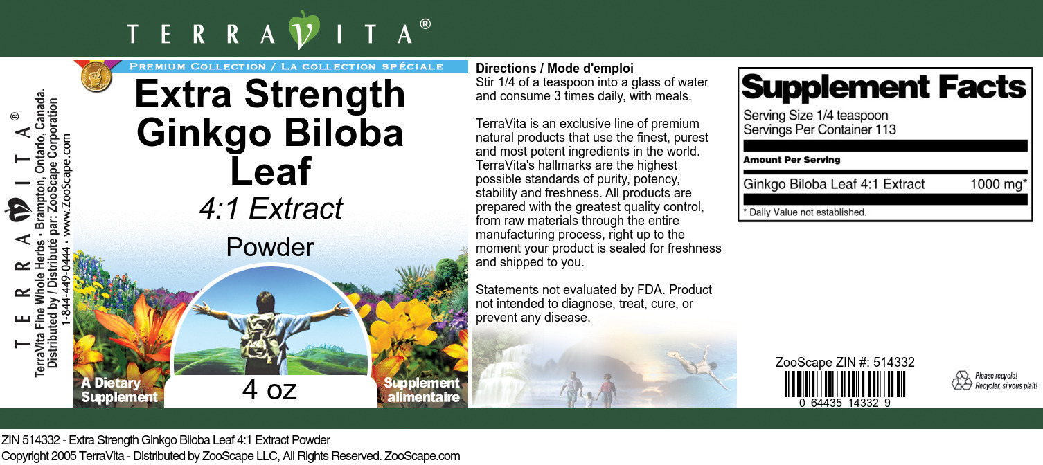 | Extra Strength Ginkgo Biloba Leaf 4:1 Extract Powder | 4 oz | 514332 | $26.19 | |||