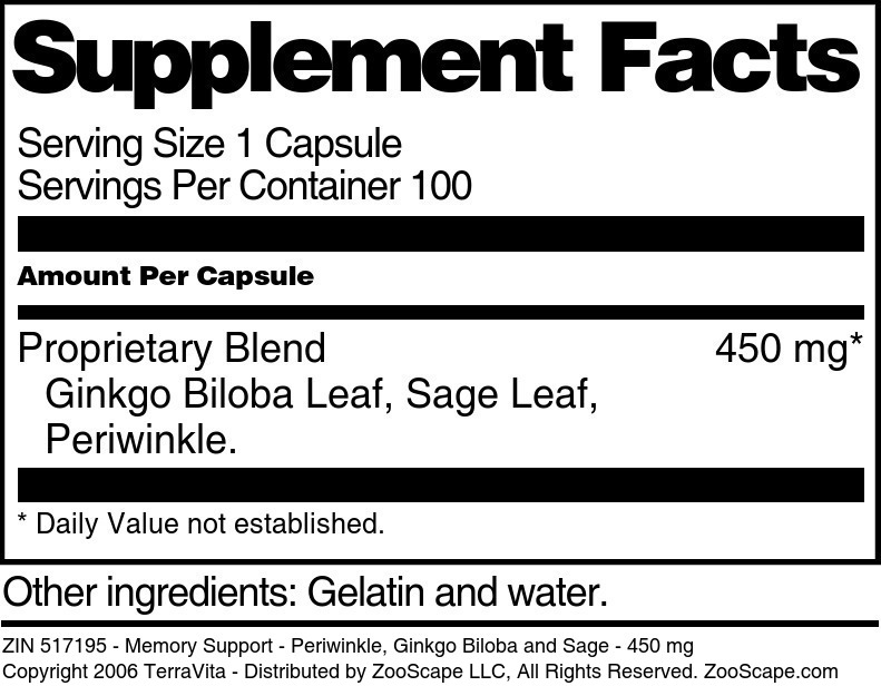 | Periwinkle, Ginkgo Biloba and Sage Blend - 450 mg | 100 capsules | 517195 | $22.45 | |||