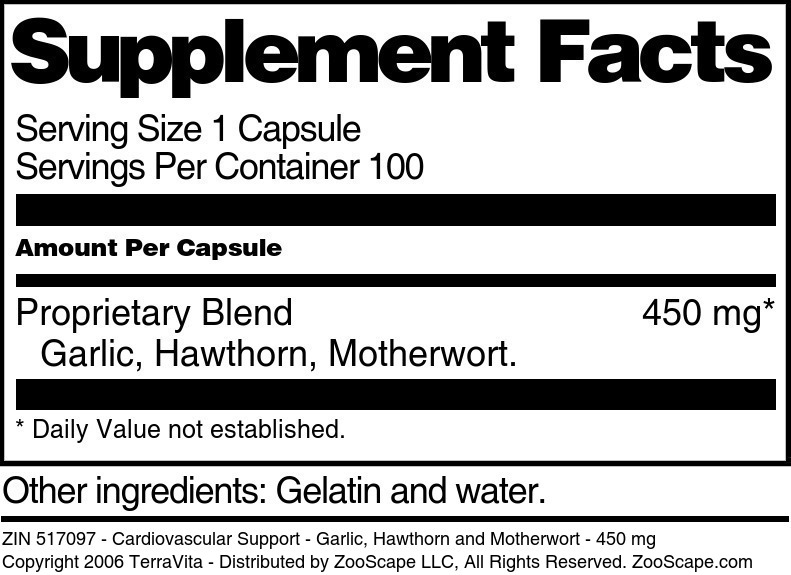 | Garlic, Hawthorn and Motherwort Blend - 450 mg | 100 capsules | 517097 | $23.92 | |||