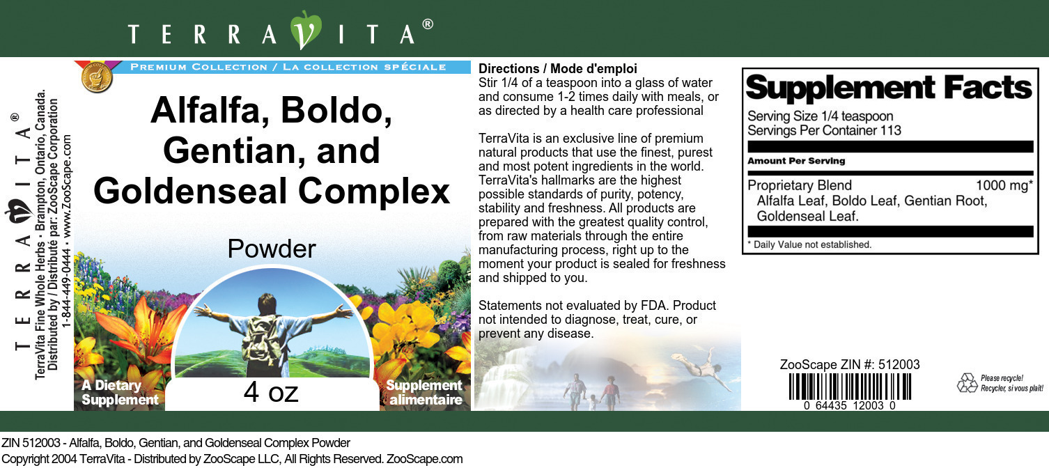 | Alfalfa, Boldo, Gentian, and Goldenseal Complex Powder | 4 oz | 512003 | $22.22 | |||
