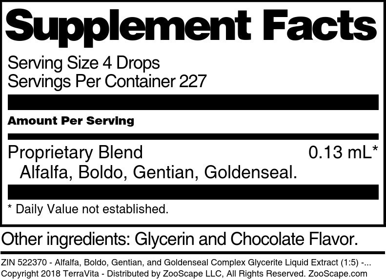 | Alfalfa, Boldo, Gentian, and Goldenseal Complex Glycerite Liquid Extract (1:5) | 1 oz - No Flavor | 522367 | $20.94 | |||