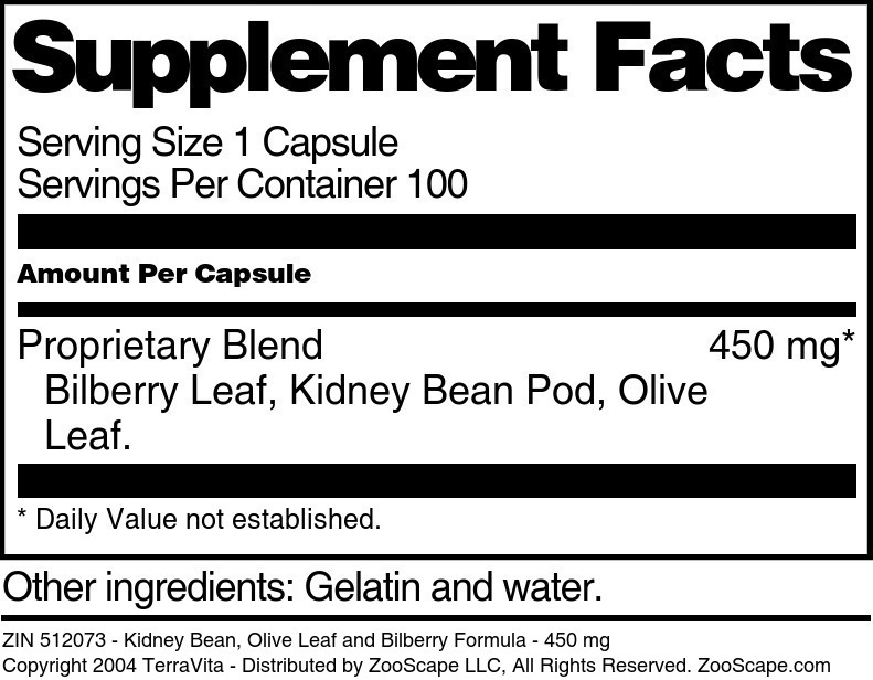 | Kidney Bean, Olive Leaf and Bilberry Formula - 450 mg | 100 capsules | 512073 | $23.34 | |||